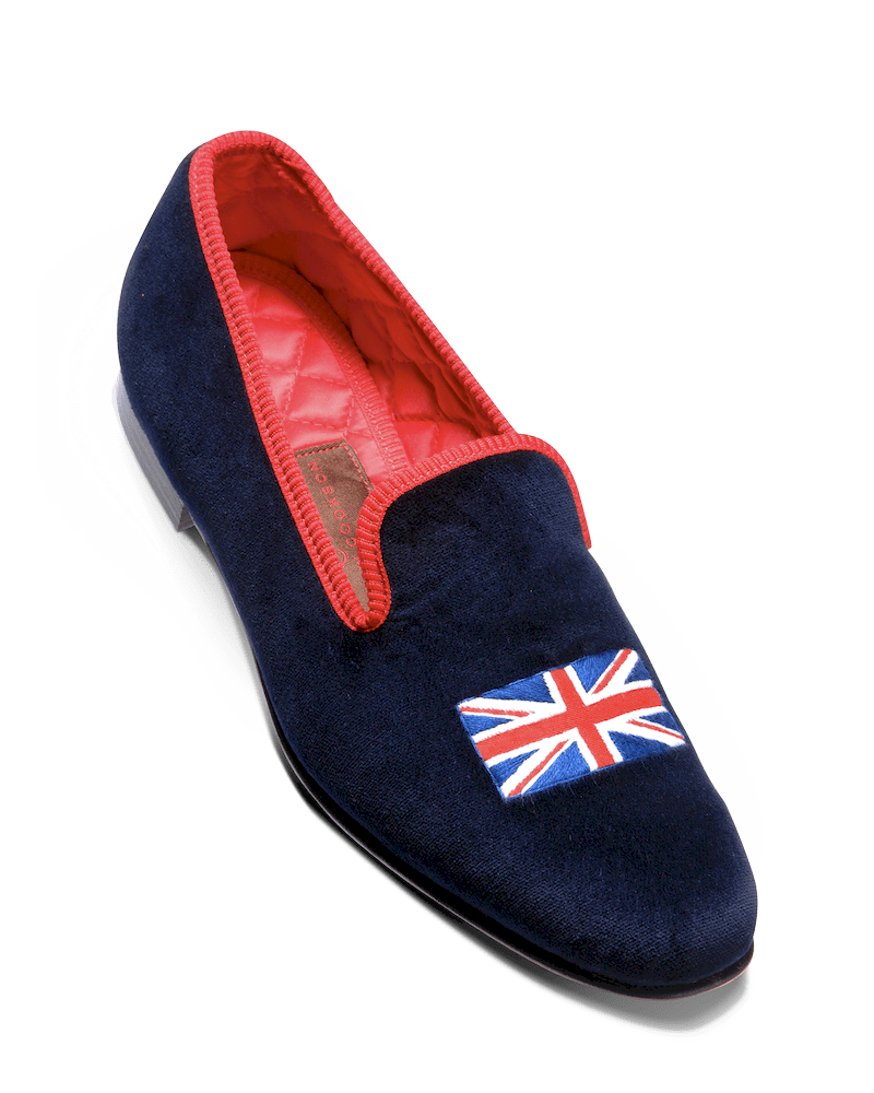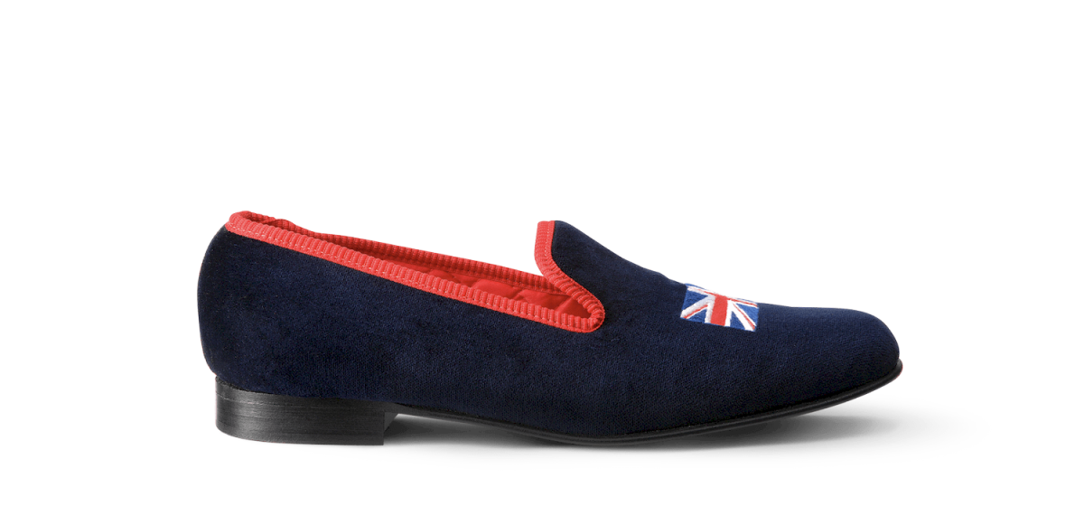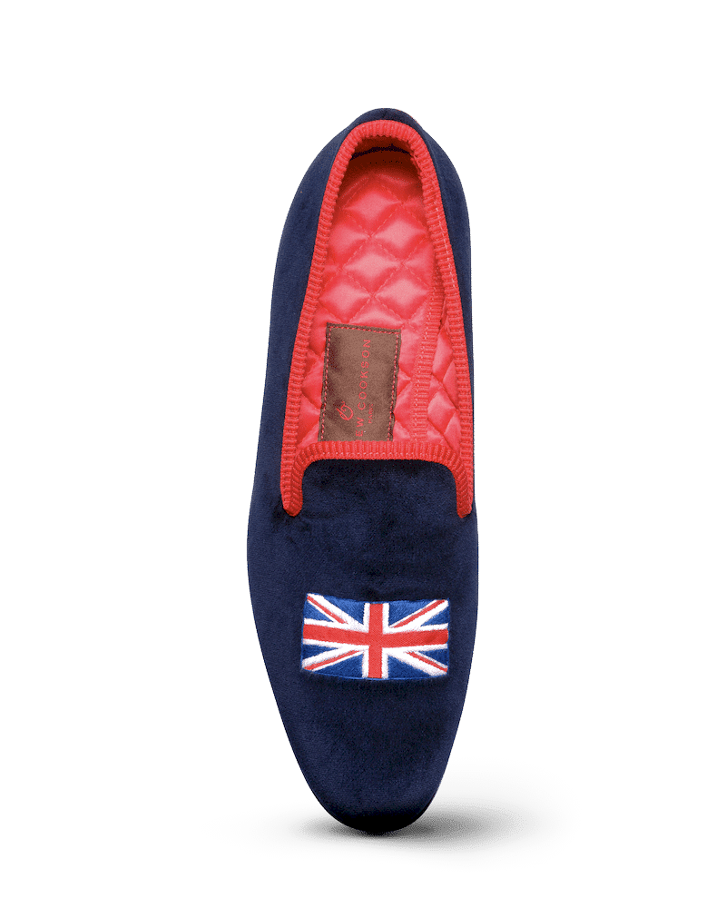 Les slippers union jack Matthew Cookson sont faites en velours de coton et brodées à la main, la doublure est en satin matelassé, le tout monté sur une fine semelle en cuir. Le summum de l’élégance et du confort.