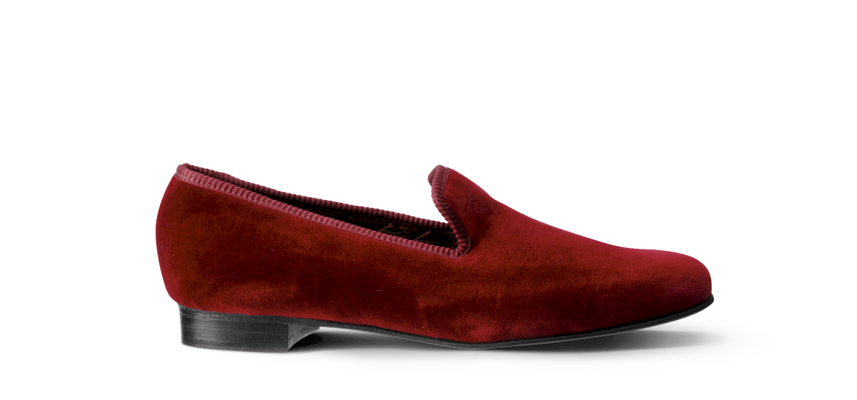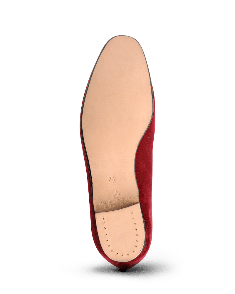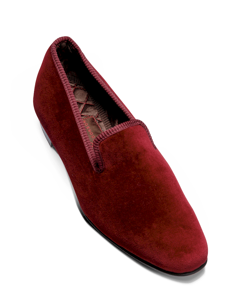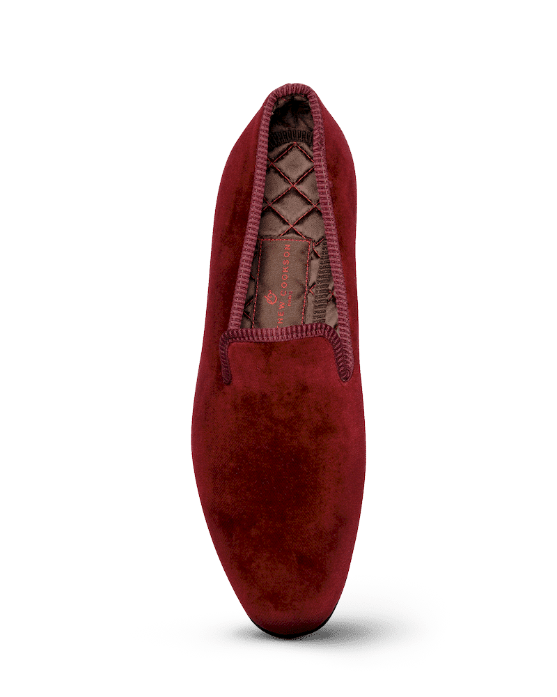 Les slippers bordeaux Matthew Cookson sont faites en velours de coton, la doublure est en satin matelassé, le tout monté sur une fine semelle en cuir. Le summum de l’élégance et du confort.