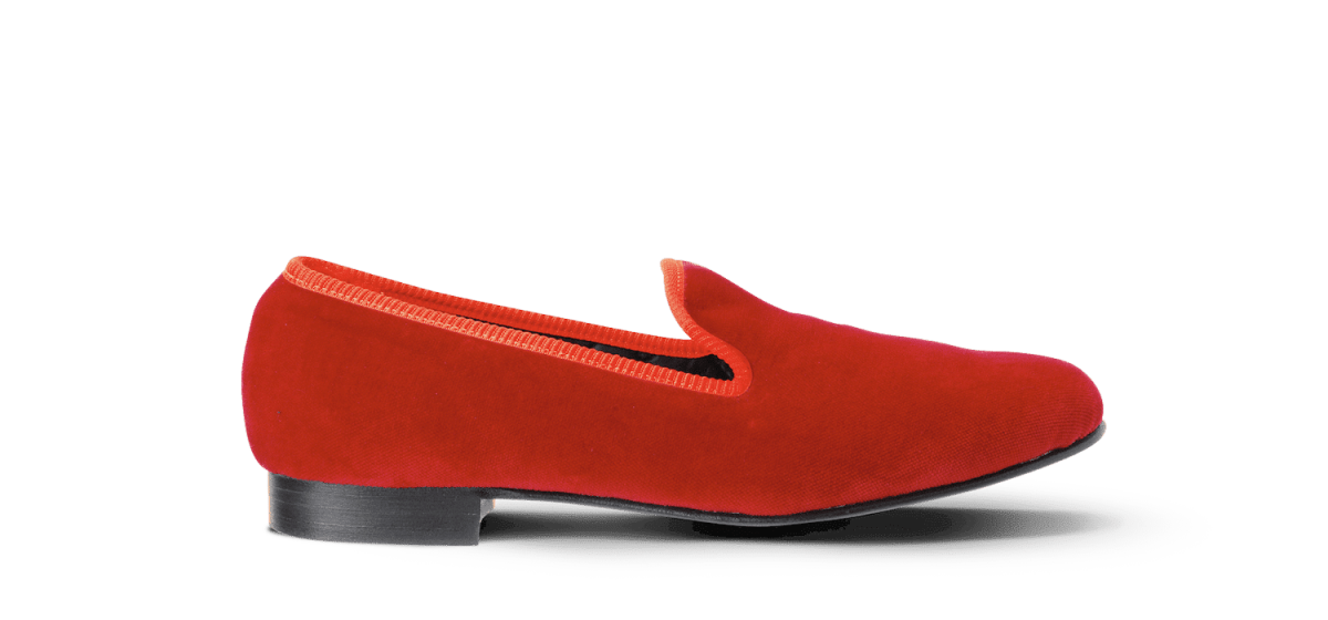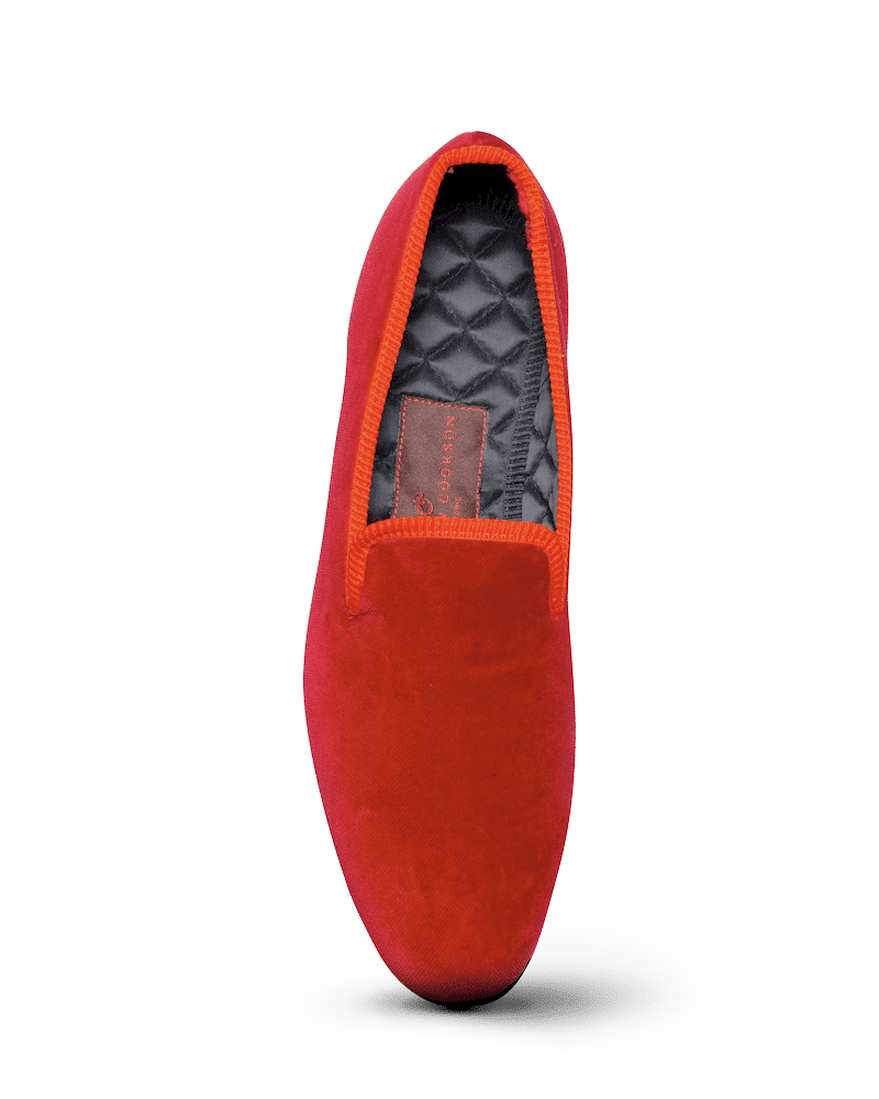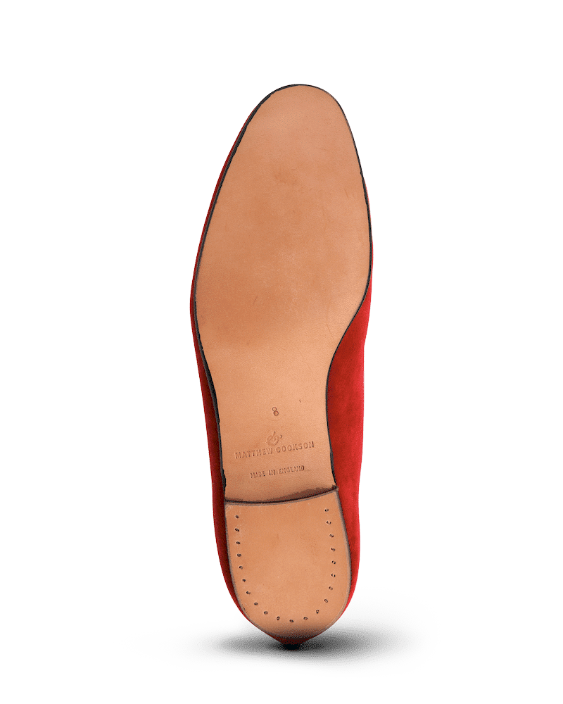 Les slippers rouge Matthew Cookson sont faites en velours de coton, la doublure est en satin matelassé, le tout monté sur une fine semelle en cuir. Le summum de l’élégance et du confort.