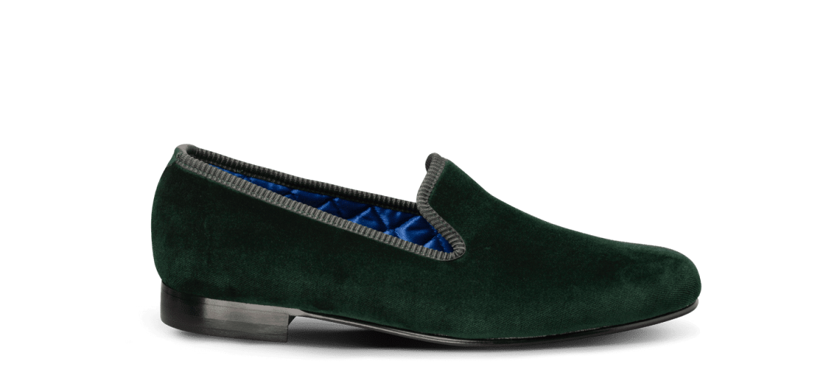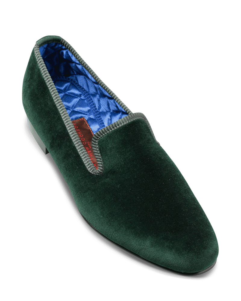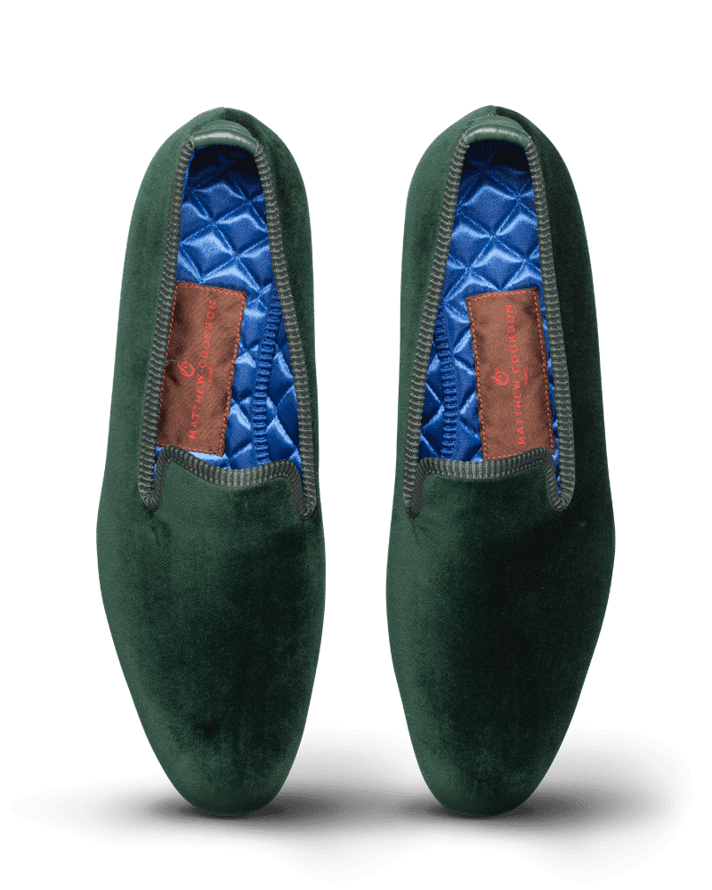 Les slippers vert anglais Matthew Cookson sont faites en velours de coton, la doublure est en satin matelassé, le tout monté sur une fine semelle en cuir. Le summum de l’élégance et du confort.