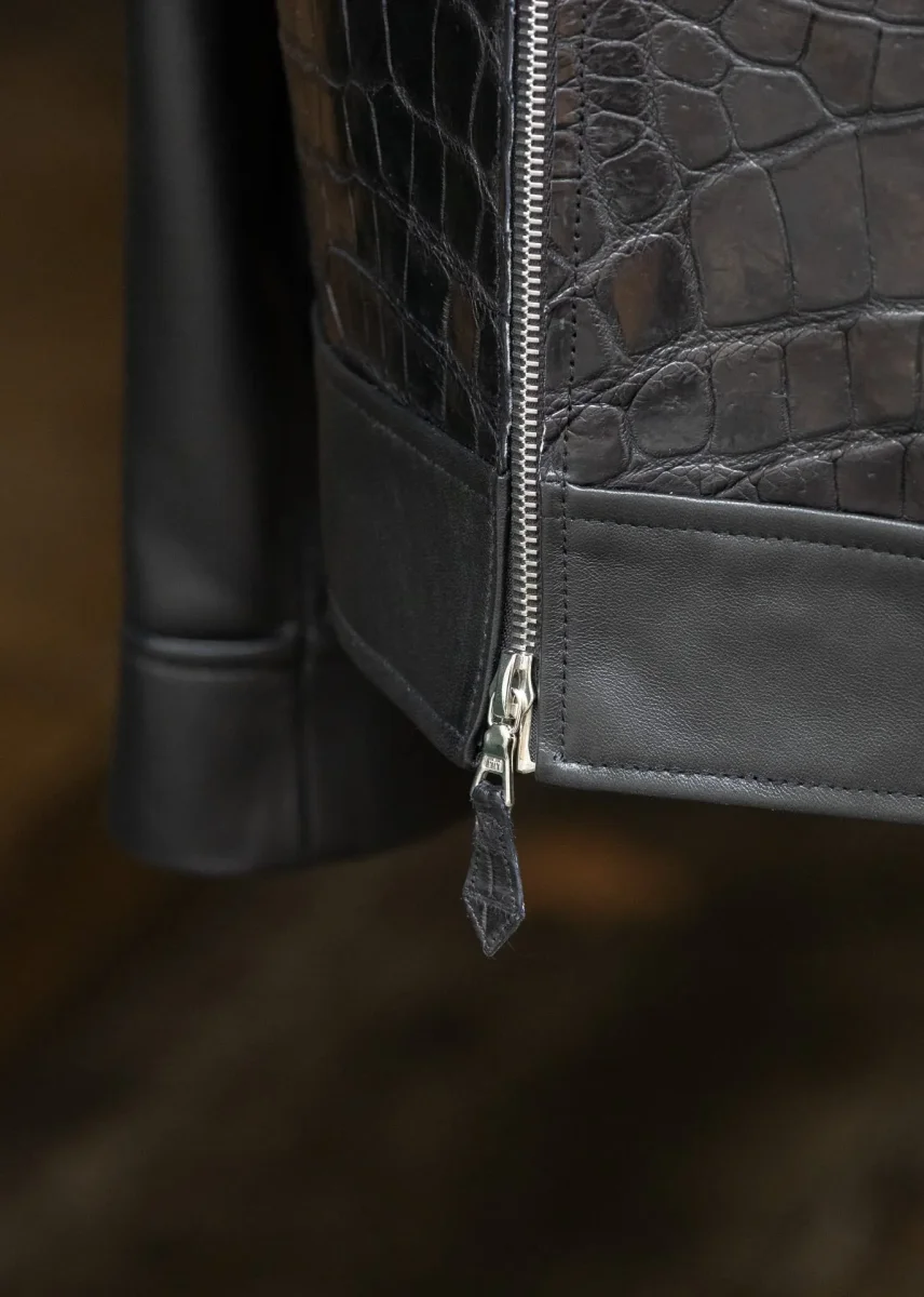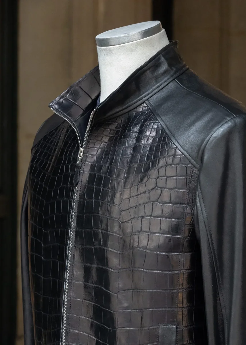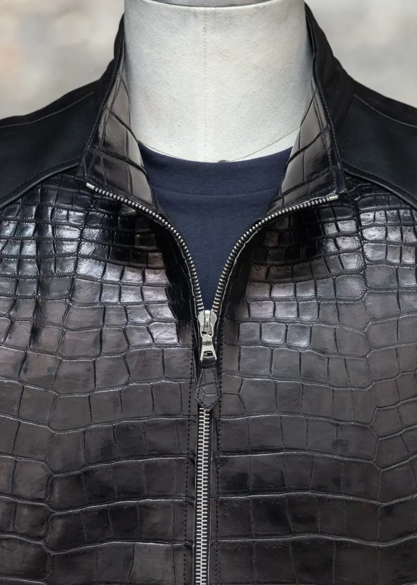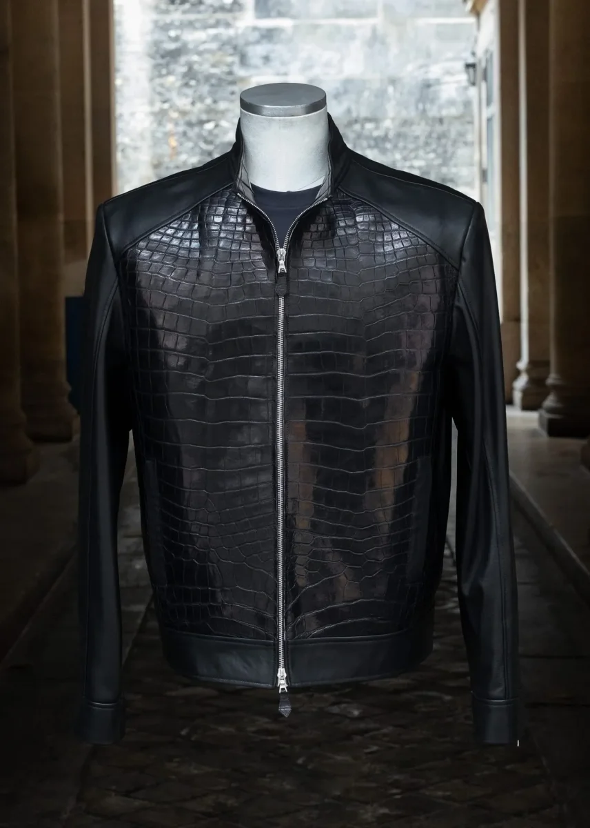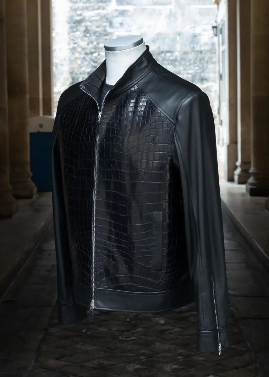 Pièce d’exception – Élégance radicale Description Cette veste en cuir de crocodile noir et agneau plongé noir incarne une vision radicale et contemporaine du vestiaire de luxe. Pensée comme une pièce forte, elle associe la présence graphique du crocodile à la souplesse extrême de l’agneau plongé, dans un équilibre parfaitement maîtrisé. Le panneau frontal en cuir de crocodile apporte structure, relief et profondeur, tandis que les manches, le dos et les empiècements en agneau plongé assurent confort, fluidité et port naturel. La coupe est nette, précise, sans superflu, soulignée par un col montant, une fermeture zippée intégrale et des manches…